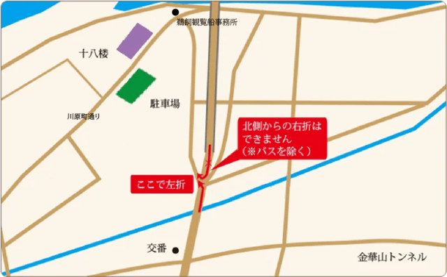 ※長良橋を渡って北からお越しの場合、鋭角の右折はできません。(マイクロバス以上の車両は可)